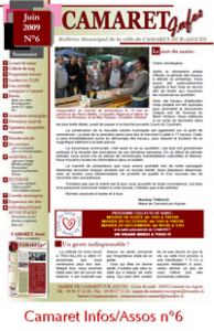 Nous avions du refaire un magazine à partir de zéro, l’ancienne formule réalisée en interne par les élus de la mandature précédente ne pouvant être poursuivi. Dans l’urgence, une première formule réalisée par nos soins avec les « moyens du bord » n’était guère satisfaisante dans sa qualité, mais a néanmoins assuré la continuité de l’information municipale en permettant de distribuer le premier « Camaret Infos » dès le mois de mai (pour la petite histoire, ça fait un drôle d’effet que de créer une mise en page où l’on doive taper soi-même le nom de son propre père dans la rubrique nécrologique / Camaret Infos n° 8 nov 2009, p.10).