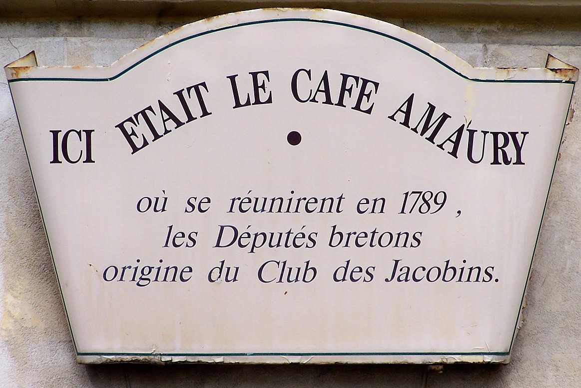 Le premier club révolutionnaire fut le Club breton créé en 1789. Les députés du Tiers de Bretagne se réunissait au café Amaury à Versailles pour travailler leur contribution aux États généraux. Il se développera rapidement pour devenir successivement la Société de la Révolution, puis la Société des Amis de la Constitution, enfin le Club des jacobins installé au couvent des jacobins de la rue Saint-Honoré.