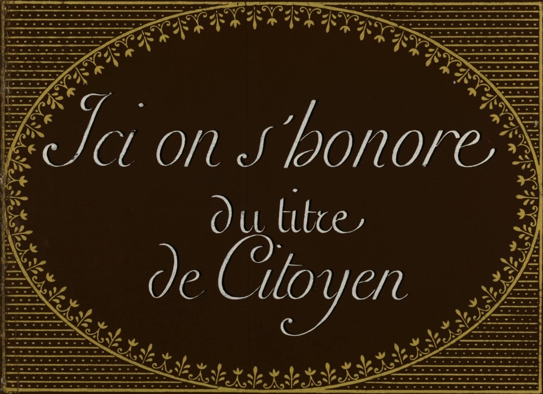 - Papier peint « Ici on s’honore du titre de citoyen », Manufacture Berthelot, 1799 : exemple de panneau affiché dans les lieux publics pendant la Révolution (crédit : Bibliothèque nationale de France).