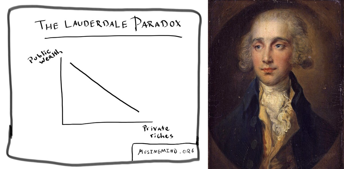 La richesse publique s’évalue en terme de valeur d’usage, qui repose sur le principe d’abondance (du moins de suffisance compte-tenu de la finitude des ressources). La richesse privée, elle, s’évalue en terme de valeur d’échange qui repose à l’inverse sur le principe de rareté. Par exemple, la richesse privée d’un producteur agroalimentaire repose sur le prix de ses produits. Il sera d’autant plus « riche » qu’il vendra cher. Une richesse alimentaire publique reposerait à l’inverse sur une offre abondante à des prix abordables. L’intérêt public évolue donc bien à raison inverse de l’intérêt privé, confirmant l’intuition de Lauderdale. De là suit que le mot « richesse » n’a pas du tout le même sens selon qu’elle soit publique ou privée. Le parlementaire britannique regrettait, déjà en son temps, en citant le célèbre philosophe John Locke, « les méprises et la confusion qu’un faux emploi des mots répand dans le monde ». Il dénonçait aussi en ces termes l’erreur d’Adam Smith : « l’usage indifférencié du terme de richesse, pour désigner à la fois la richesse d’une nation (Wealth of a nation) et les fortunes des individus (riches of individuals) ».